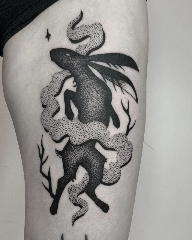 Tämä jänis löytyy omasta reidestäni. Olin pitkään tahtonut jonkin Watership Down -aiheisen tatuoinnin, ja viime syksynä päätin toteuttaa sellaisen itselleni. Tämän olisi hyvin voinut tehdä kahdessa osassa, mutta päätin viedä homman kerralla maaliin. Asento ei ymmärrettävästi ole kovin ergonominen, kuin käpertyy rullalle tuntien ajaksi oman reiden ylle. Tuloksena oli aivan uskomaton kipu niskoissa samana iltana, ja vielä tulevana viikkonakin. Mutta valmista tuli kerralla, ja nyt on puputatska!