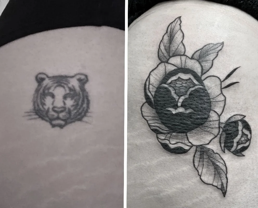 Asiakkaalla oli peittämistä kaipaava tiikeritatuointi, jonka päälle laitettiin musta kukkanen. Peitetatuointien kanssa saa laittaa aivot ihan todella raksuttamaan, mutta kaikkine haasteineen ne ovat myös todella palkitsevia töitä, kun peitettävä kuva lopulta häviää. Olen tosi tyytyväinen siihen, kuinka tiikeri saatiin piiloon, ja tämän tyyppiset kukat ovat muutenkin nättejä ja kivoja tehdä.