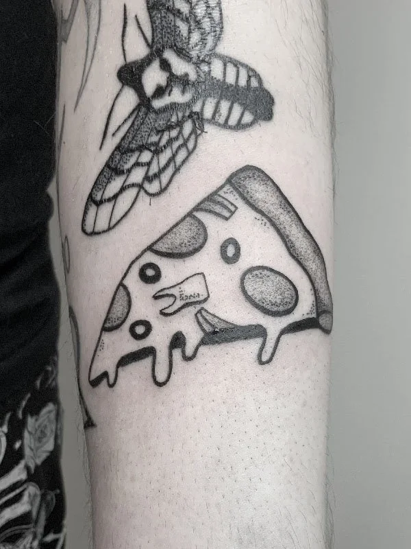 Tämä pizzaviipale on paitsi visuaalisesti mieleeni, sillä on lisäksi hauska tarina. Asiakkaani kaverilta oli irronnut hammas pizzaa syödessä, ja asiakas otti kaverinsa tietämättä tämän tatuoinnin hampaan kunniaksi. Pääsin näkemään myös videon hetkestä, kun tatuointi paljastettiin hampaansa hukanneelle kaverille. Loistavia juttuja.