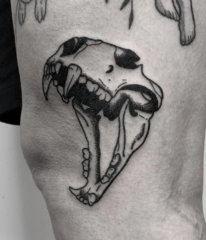 Tässä leijonan kallossa yhdistyy kivasti blackwork, dotwork ja paksut linjat, jotka ovat omia lempparijuttujani tatuoinneissa. Kallot toimii aina, ja tässä oli hauska polvenhaukkausasettelu.