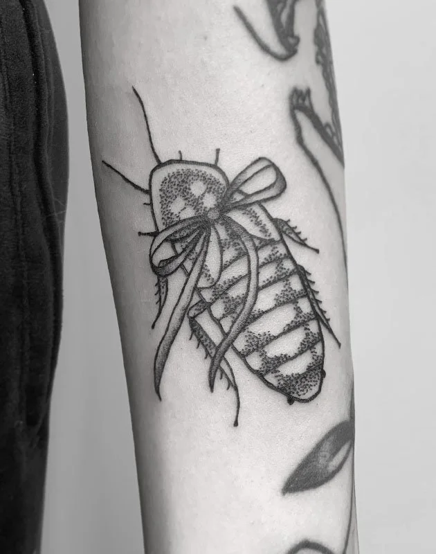 Olin innoissani ihan vaan siitä, kun asiakas kertoi haluavansa tämän torakan flasheistäni. Mutta homma vaan parani, kun hän pyysi lisäämään ötökkäystävällemme pienen rusetin koristeeksi. 10/10, no notes.