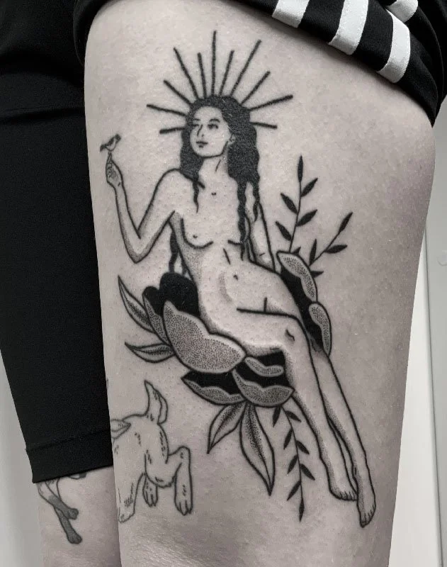 Vakkarini valitsi flasheistäni tämän luontoäidin, johon tein pieniä muokkauksia ja lisäyksiä. Naishahmot ovat mulle aina mieluisia töitä, ja tästä tuli mun mielestä tosi kaunis tatuointi. Olen tehnyt näihin jalkoihin paljon kasvi -ja eläinkuvia, joten tämä luontoäiti kävi mukavasti joukkoon.