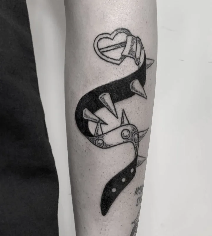 Tämä blackwork-piikkiremmi tehtiin mun flasheistä, solki muokattiin vielä sydämeksi asiakkaan toiveesta. Oli siistiä päästä tekemään tämä vähän isommassa kokoluokassa etusääreen, onhan tää nyt hiton badass.