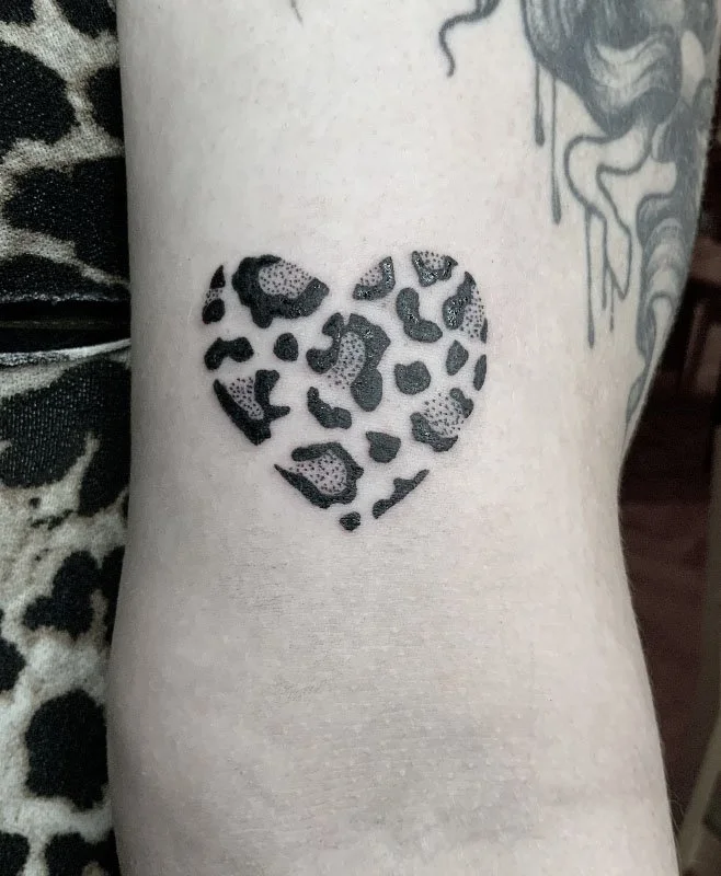 Osallistuin viime vuonna ensimmäistä kertaa tatuointimessuille artistina Savonlinnan Kasino Tattoo Conventionissa. Flash-kansiossani oli reilu 100 vapaata mallia, mutta mulle heräsi pieni etiäinen, että päätyisin messujen aikana tekemään juuri tämän leopardisydämen. Ja kuinkas kävikään, messujen ovet aukesivat, eikä kauaa mennyt kun ensimmäinen messuasiakkaani valitsi kyseisen sydämen, leopardimekko yllänsä. Aika jännä sattuma…